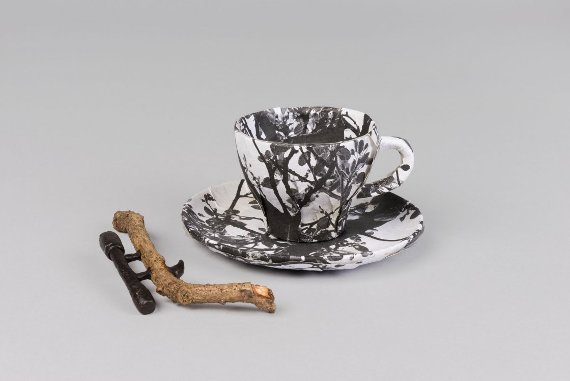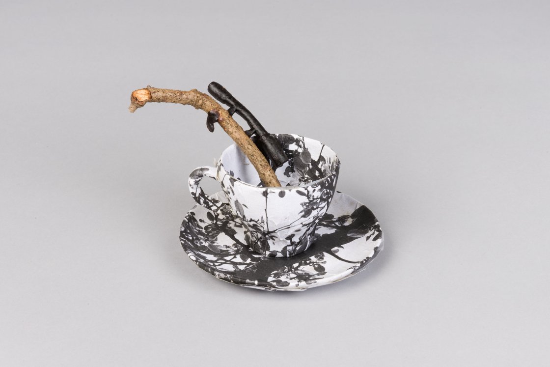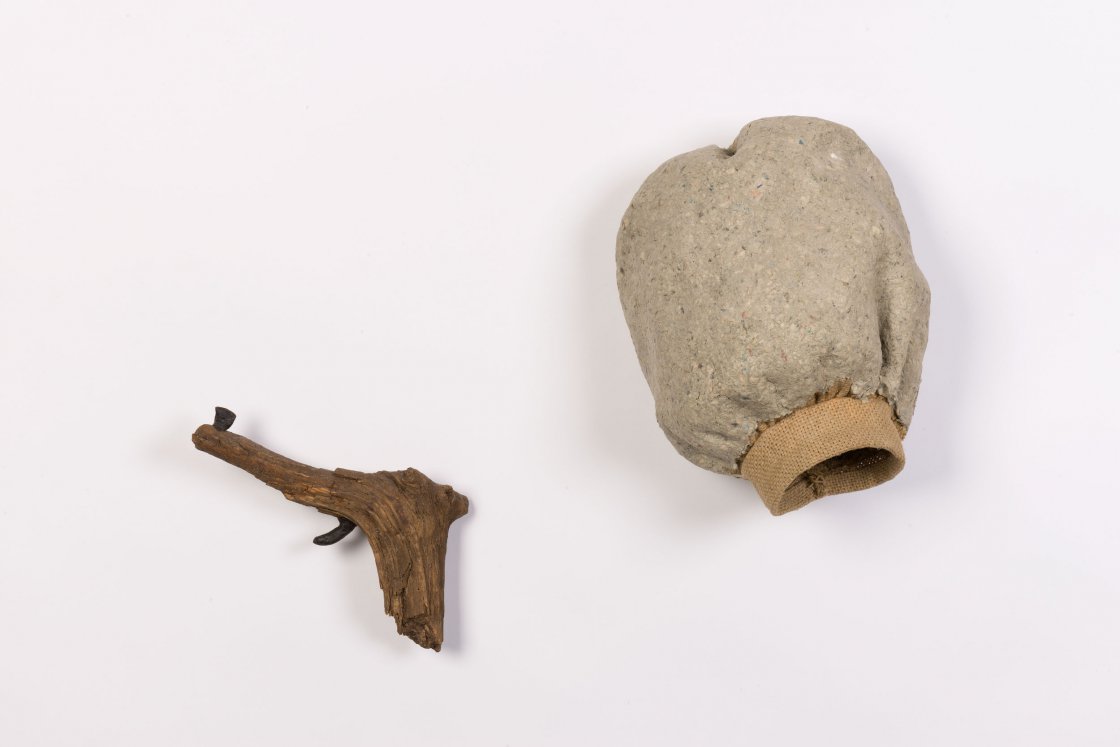 Hoewel herkenbaar in vorm –een pistool met een pofmouw- geeft het werk van Overberg zich niet makkelijk prijs. Wat je ziet is dan ook niet een pistool en een echte mouw. Nee het is een takje in de vorm van een pistool, de korrel en de trekker zijn van was. Alles wat een echt pistool niet is. Tegenoverstelde materialen. Staal tegenover was en hout. Zo ook de pofmouw. Deze is niet van stof maar van een soort papier-maché.