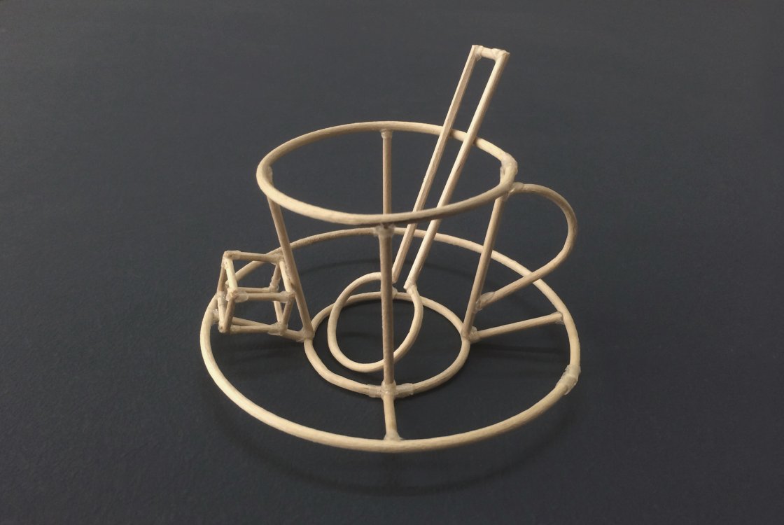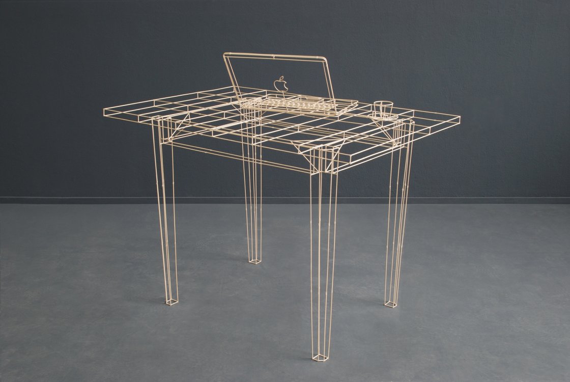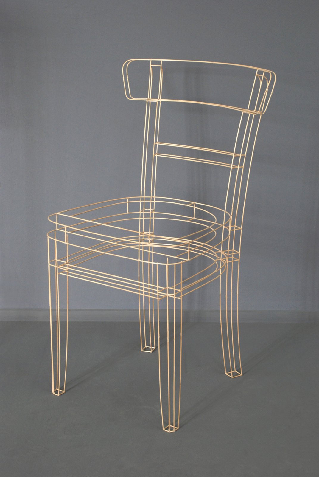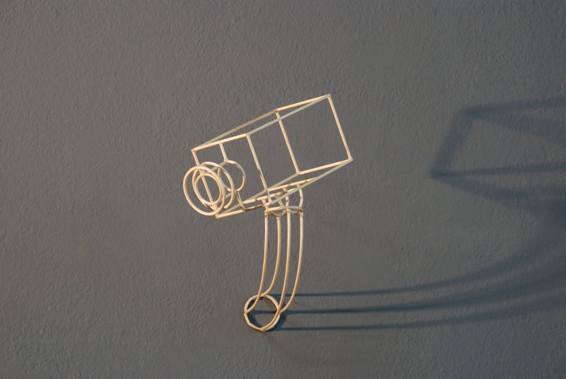 Janusz Grünspek probeert zoals iedere kunstenaar zijn ideeën en gedachten om te zetten in werkelijk beeld. Hij gebruikt daarvoor een veelheid aan technieken. Een van de technieken die hij toepast leidt tot wat het beste omschreven kan worden als ruimtelijke tekeningen. Met zeer eenvoudige materialen –satéstokjes en een lijmpistool- heeft hij een techniek ontwikkeld en verfijnd om met name dagelijkse voorwerpen in fragiele houten lijnen weer te geven. Een stoel, een tafel, een computer, een bewakingscamera. Al deze voorwerpen zet hij 1 :1 uit in een transparant lijnenspel dat betoverend werkt op de beschouwer. Licht als een veertje zijn de “tekeningen” op te tillen en te verplaatsen. De werkelijk stoel is teruggebracht tot een fractie van zijn werkelijk gewicht en materiaal. Het betovert en stemt tot nadenken.