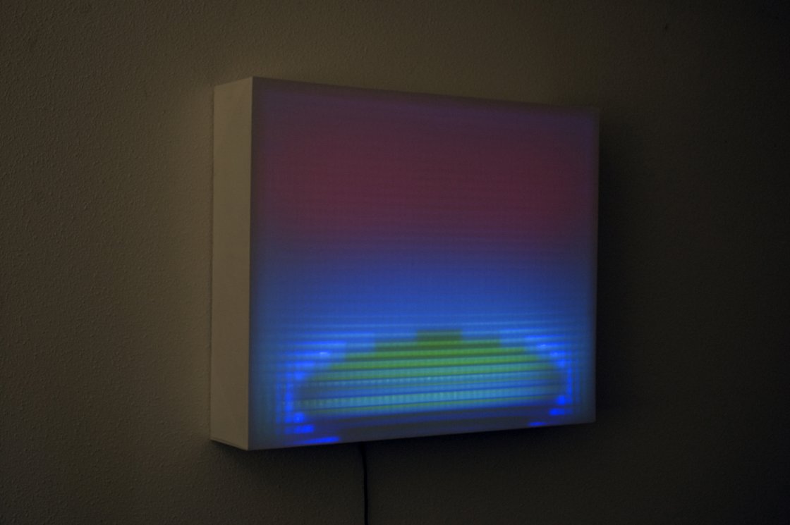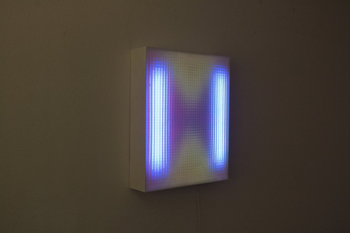 Glas maakt beelden met licht. Het zijn lichtbakken waarin hij met gekleurd karton, papier, rasters en licht constructies bouwt die tezamen een beeld projecteren op de buitenzijde. De beelden zijn samensmeltingen van kleurvlekken, schaduwen en onscherpe rasters. Een ongrijpbaar beeld dat eigenlijk niet bestaat. Glas is een onderzoeker en experimenteerder die nauwgezet en procesmatig aan zijn beelden werkt en van tevoren niet weet waar het naartoe zal gaan. Ook in zijn prints op papier spelen licht en schaduw een grote rol. Is het een lens waardoor je kijkt, of is het een beeld van een planeet? Het lijken landschappen waarnaar je kijkt. Ze zijn koel en ondoorgrondelijk. Net als bij de lichtbeelden weet je niet waarnaar je kijkt en kun je het beeld niet vangen .