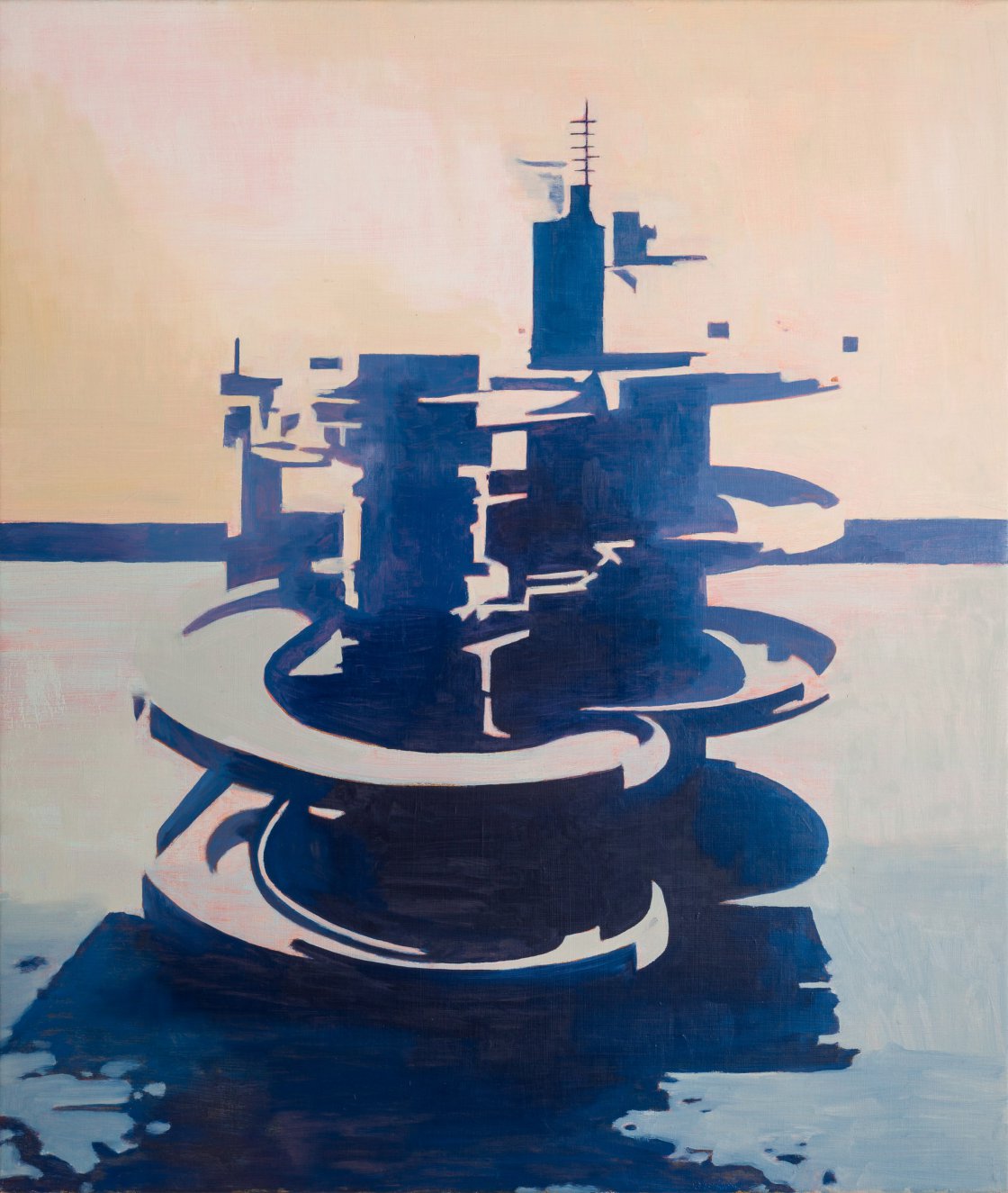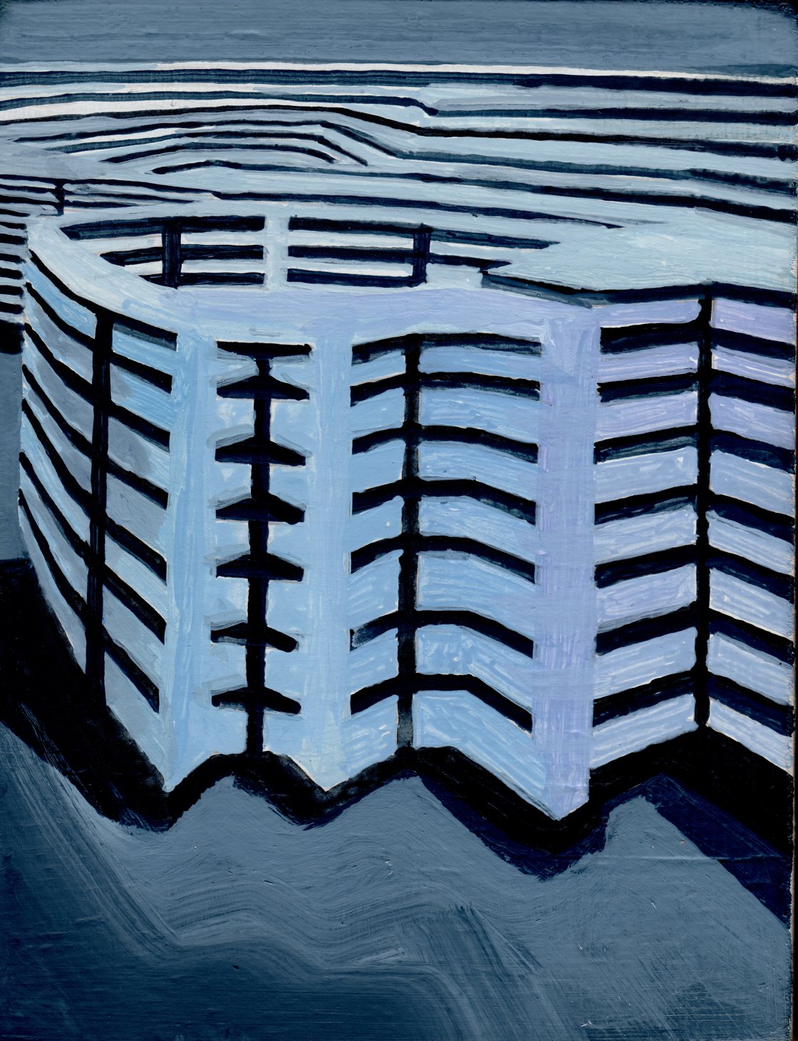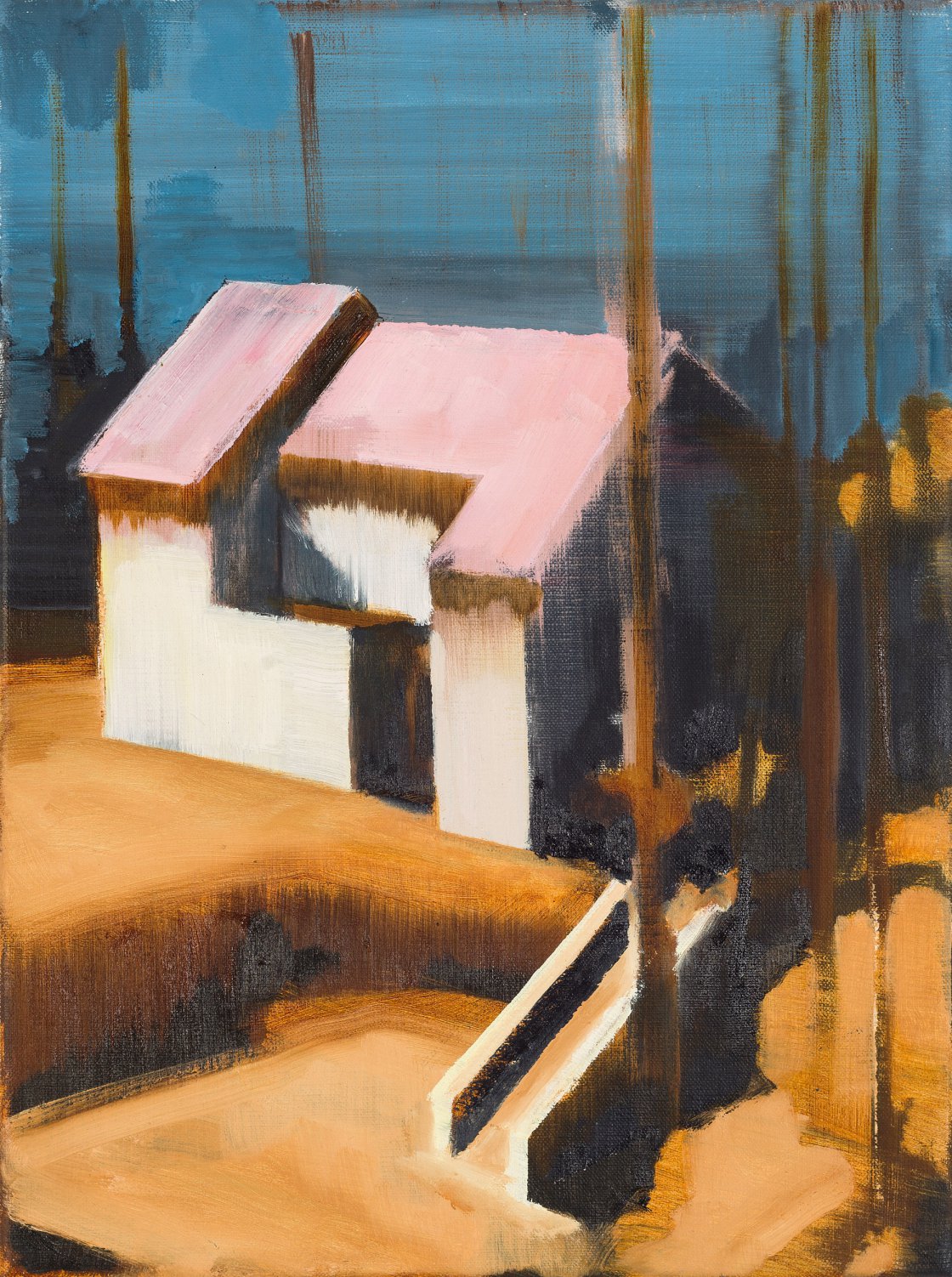 Schildert Marcel Doorduin naar de werkelijkheid of naar modellen die hij misschien zelf maakt alvorens te gaan schilderen? De paneeltjes en schilderijen van Doorduin hebben vaak huizen en gebouwen als onderwerp. Slechts sporadisch is iets van een omgeving en natuur te zien. Vermoedelijk heeft een van de werken een speelgoedgarage als onderwerp, althans daar lijkt het op. In het schilderij kun je geen schaal meer ontdekken omdat een echte omgeving ontbreekt. Opgebouwd uit geel en blauwzwarte schaduwen ontstaat er een beeld dat je zelf met je ogen moet afmaken. Slechts een spiegeling en horizon suggereren dat het gebouw misschien in het water staat. In de schilderijen van Doorduin ligt de wereld van Marklin en Faller schaalmodellen altijd op de loer.