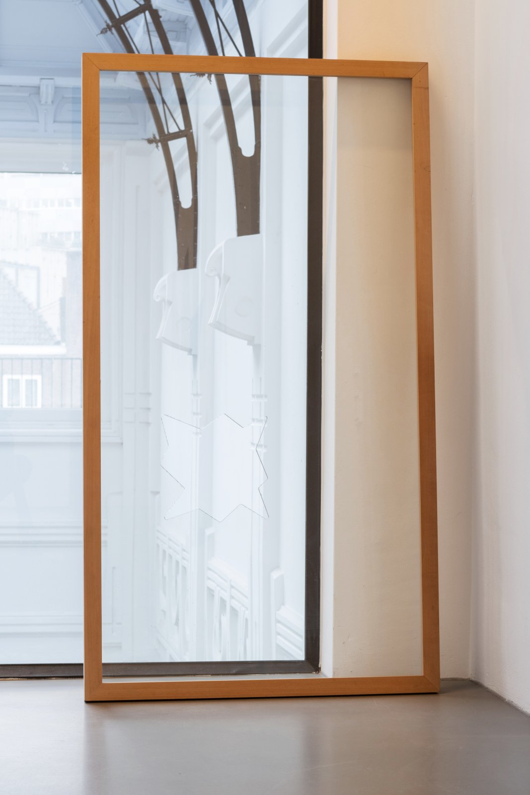 Een grote glasplaat gevat in een houten lijst die al heel wat heeft meegemaakt. Waarschijnlijk is dit zware werk door de jaren heen van tentoonstelling naar tentoonstelling gesleept. Bij collectie DE.GROEN heeft het de rust gevonden. Hier blijft het en met regelmaat is het werk te zien. Ik wil niet zeggen dat dit werk alles in zich draagt dat karakteristiek is voor het werk van Teulings maar het komt er wel dichtbij. Teulings, die helaas te jong is overleden, liet een mooi oeuvre na en voor ons is DumbO een ‘lievelingswerk’ binnen die nalatenschap. Waarom eigenlijk? Je kunt het werk in zijn totaliteit bekijken, het glas, de gaten in het glas en dan nog de spiegelvorm die de gaten met elkaar verbindt. En dát, die spiegelvorm, daar gaat het om. Hoe lastig het ook is om dit werk te doorgronden, wie naar die spiegel kijkt ziet een wonderlijk staaltje van esthetiek. Of kan ik het beter anti-esthetiek noemen? Het verhaal is dat Teulings de opdracht gaf aan een ambachtsman om dit werk te maken. Op een A-viertje maakte hij een schets. Over het formaat, waarschijnlijk ook over de grootte van de gaten en ook met de opmerking om deze gaten middels een spiegelvorm met elkaar te verbinden. Wanneer je lang naar het werk kijkt, moet je de conclusie trekken dat geen kunstenaar die gaten op deze manier en in deze vorm met elkaar verbonden zou hebben. De ambachtsman heeft op zijn geheel eigen manier de vraag opgelost. Hij heeft de spiegelvorm bedacht. Toen Teulings zijn werk zag zei hij: “ik zou het zelf nooit zo gemaakt hebben.” Voor Teulings die als kunstenaar en filosoof zich liet inspireren door het werk van Marcel Duchamp was dit werk DumbO misschien wel een manier om niet alleen zijn eigen ‘denken’ als kunstenaar vast te leggen en te bewijzen, maar ook om het werk van Marcel Duchamp te gedenken. Wat blijft voor mij is die enorme anti-esthetiek in die spiegelvorm in het centrum van dit werk. Ik zeg erbij dat ik niet zeker weet of anti-esthetiek het juiste woord is.