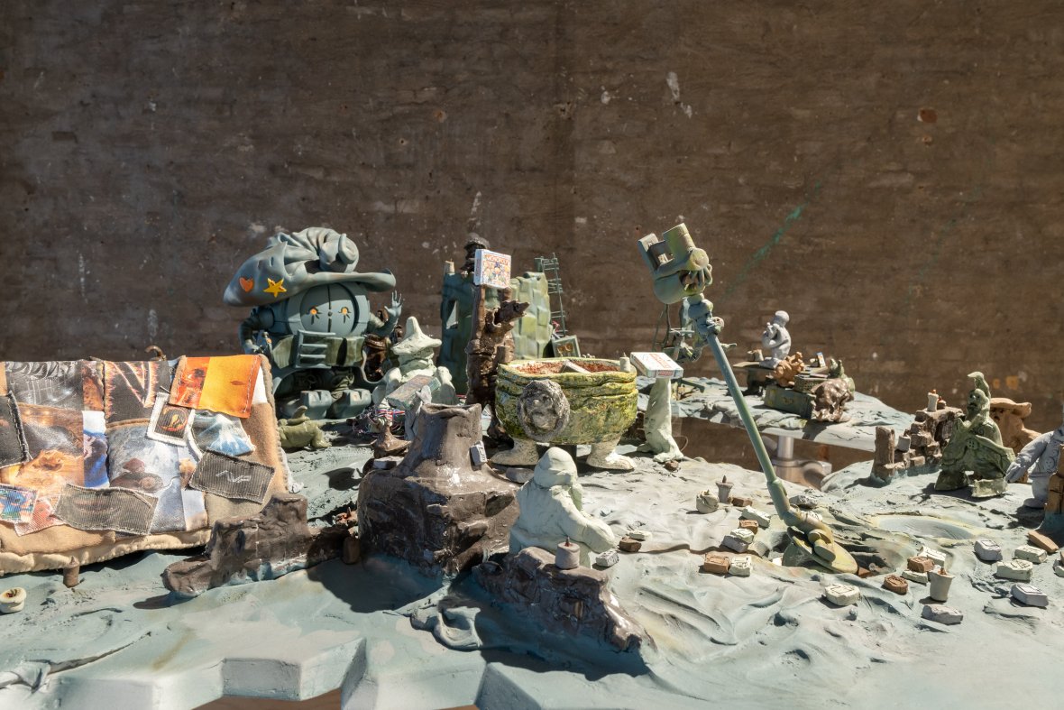 Voor het raam, in het midden van de ruimte staat de “wereld” van. Komt TIDE Komt Raet verbeeldt de wereld Rik Laging en Thijs Jager. Op een sokkel die ook dienstdoet als verpakkingskist, schotelen zij ons een indrukwekkende fantasiewereld voor. Vol geluid en beweging. In feite zijn het twee werelden. Een boven- en een onderwereld. De bovenwereld bestaat uit fragmenten uit games, SF-films, fantasiefiguren, filmkarakters, fantasiebouwsels. Kortom teveel om op te noemen. De onderwereld bestaat uit een wirwar van draden, kleine motoren en elektronica. De onderwereld stuurt de bovenwereld aan en zorgt ervoor dat alles in beweging blijft. Thijs Jaeger spreekt over duister werk met een knipoog. En zo is het.